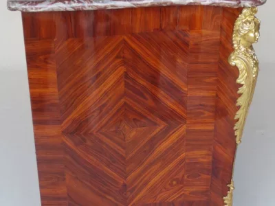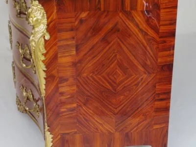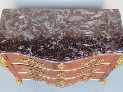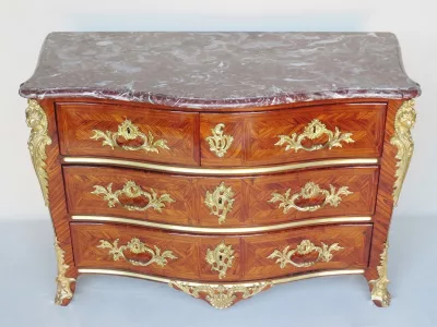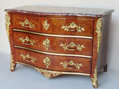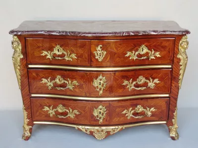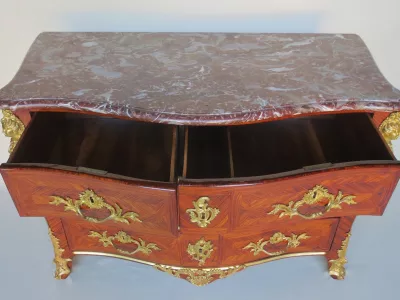 Cette élégante commode d'époque Régence est en placage de bois de violette, elle est coiffée d'un marbre rouge royal bordé d'une moulure en bec de corbin. Elle ouvre en façade par quatre tiroirs sur trois rangs, séparés par des traverses foncées de cannelures de laiton. Ses poignées, ses entrées de serrures ainsi que ses chutes sont en bronze verni doré. Sa façade et ses cotés sont agréablement galbés, les intérieurs de tiroirs sont en noyer et son âme est en sapin. Caractéristique de la Régence, cette sorte de commode ornée de chutes à buste de femme, dites espagnolettes, pourrait être attribuée au fameux ébéniste Etienne Doirat, cependant quelques artisans tout aussi prestigieux ont produit des meubles équivalents, parmi ceux-ci nous pouvons citer Criaerd ou Mondon.