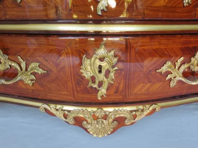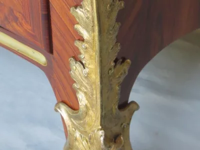 En bon état de conservation ce meuble n' a subi que très peu de restaurations, elle vient d’être revernie au tampon et ses bronzes sont d'origine, leur verni doré lui aussi d'origine est usé.