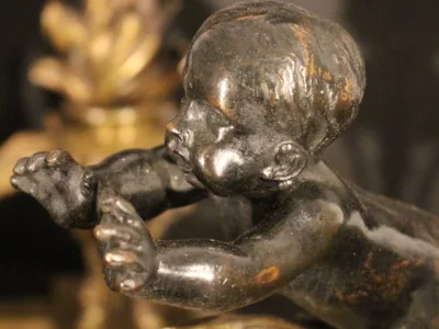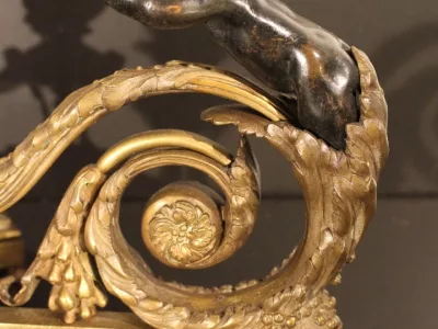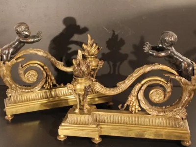 Superbe paire de chenets ,19 eme siècle Louis XVI en bronze double patines, dorée et médaille, représentant des anges de part en part se réchauffant les mains devant une flamme, excellent état.
