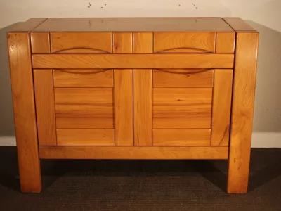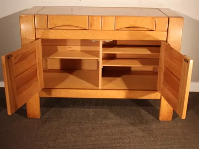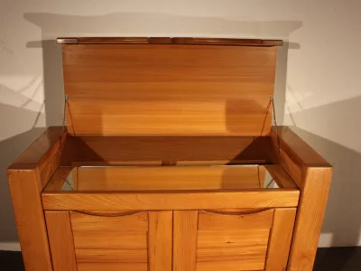 Meuble bar des années 1960-1965, de la maison Regain, entièrement en orme massif, composé d'un plateau sur sa partie haute ouvrant sur deux étagères ,une pour ranger les bouteilles et l'autre pour les verres, et de deux portes sur sa partie basse, ligne très pur qui caractérisait cette maison.