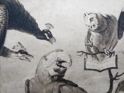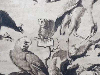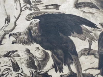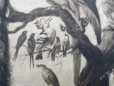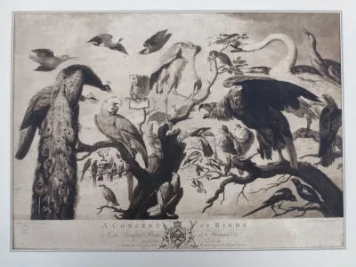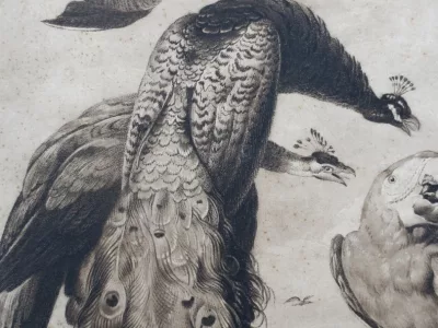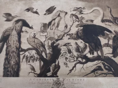 Peint par Mario Di Fiori et gravé par Richard Earlom, cette gravure du XVIIIe siècle est datée de 1778, le tableau dont elle est inspirée appartenait à Sir Robert Walpole premier ministre de Georges II et collectionneur acharné, ses trois fils sillonnaient l'Italie et la France en quête d’œuvres d'art, il avait fait bâtir Houghton Hall dans le but de conserver sa prestigieuse collection.