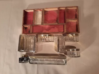 Un de toilette, avec flacons en cristal et brosses en bois noirci (manque un flacon reste le couvercle).