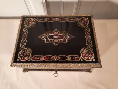 Joli coffret de voyage en bois noirci à décor incrusté de laiton, écaille de tortue et nacre.