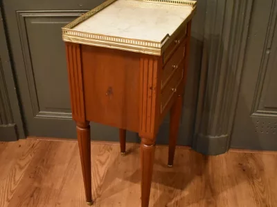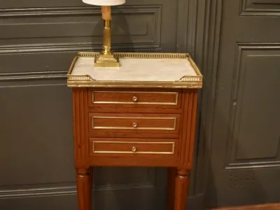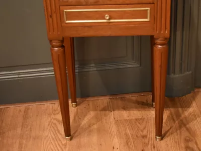 Chevet de style Louis XVI en acajou ouvrant en façade par trois tiroirs avec petits boutons, les façades des tiroirs sont