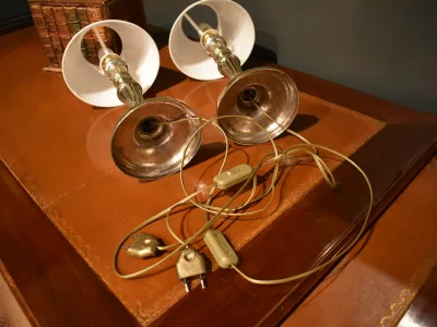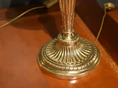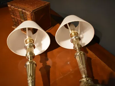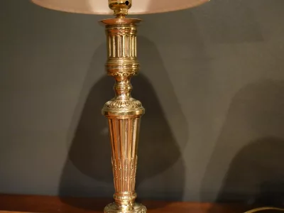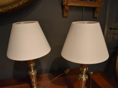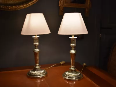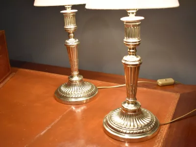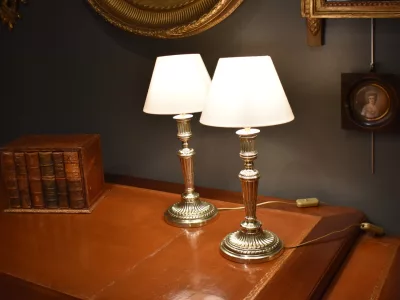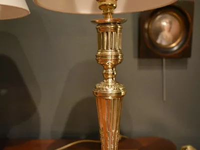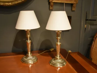 Paire de lampes de style Louis XVI montée avec une paire de bougeoirs en bronze et laiton. L'électrification est refaite avec une douille en métal doré E14. Les abat jour en coton sont neufs. Hauteur des lampes : 41.5 cm. Hauteur des bougeoirs : 27 cm Diamètre de la base : 14 cm Diamètres des abat jour : 19 cm au maximum, 10  cm au minimum, hauteur de 13 cm. A noter : traces d'argenture ancienne. Envoi possible. Chaque demande de renseignements par mail fera l'objet d'une réponse, merci de contrôler les messages indésirables