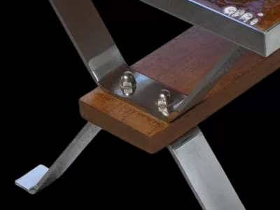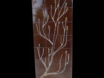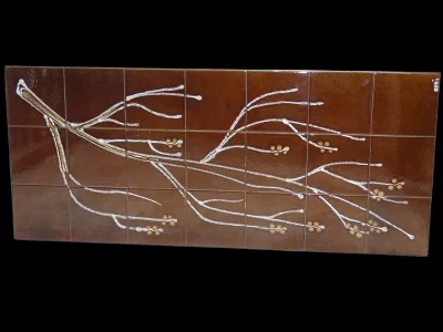 Signée ADRI ( Vallauris ) , plateau en carreaux de céramique polychrome à décor végétal entouré d'une ceinture chromée , piètement en X chromé supportant une tablette en bois .