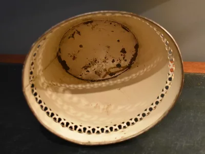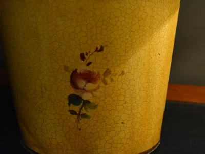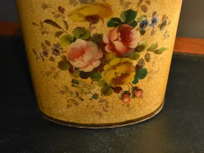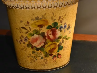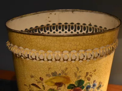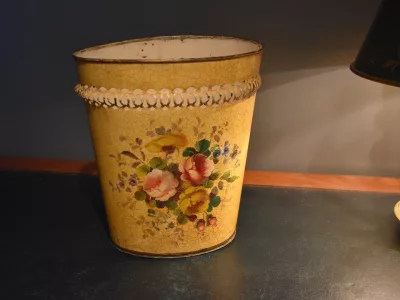 Corbeille à papiers en tôle peinte à décor de fleurs sur fond jaune, avec  une frise ajourée dans la partie supérieure. Bon état avec traces d'usage. Envoi possible. Chaque demande de renseignements par mail fera l'objet d'une réponse, merci de contrôler les messages indésirables.