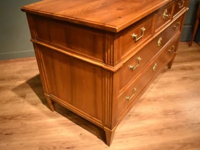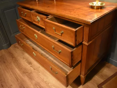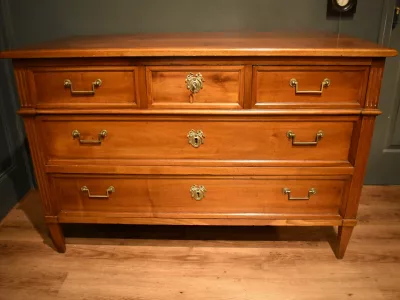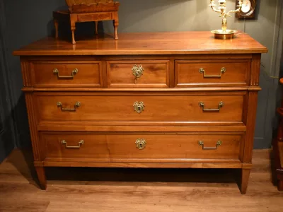 Commode en noyer Louis XVI, ouvrant en façade par cinq tiroirs sur trois rangs, avec poignées tombantes. Une clé avec serrure permet l'ouverture du tiroir central du rang supérieur. Les montants avant et arrière sont cannelés. Elle repose sur quatre pieds gainés à section carrée. Commode en très bon état, Chaque demande de renseignements par mail fera l'objet d'une réponse, merci de contrôler les messages indésirables.