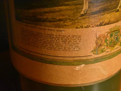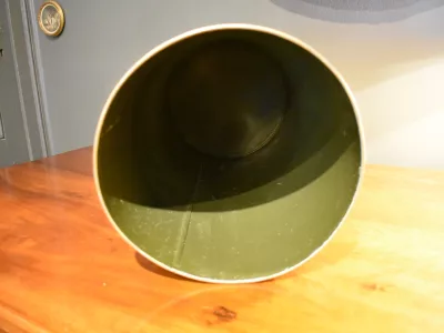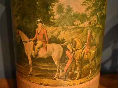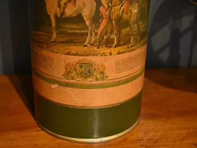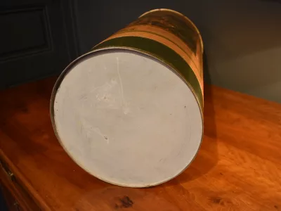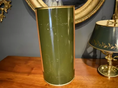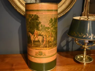 Porte parapluies ou porte cannes en tôle peinte de forme cylindrique dans les tons  de vert et jaune, illustré d'une  scène de rendez vous  de chasse. Envoi possible. Chaque demande de renseignements par mail fera l'objet d'une réponse, merci de contrôler les messages indésirables.