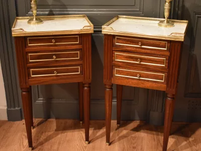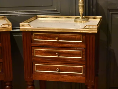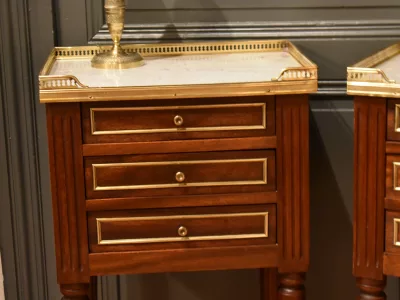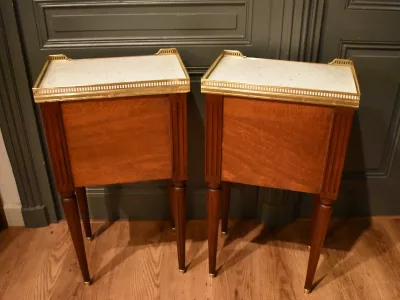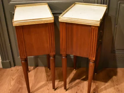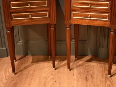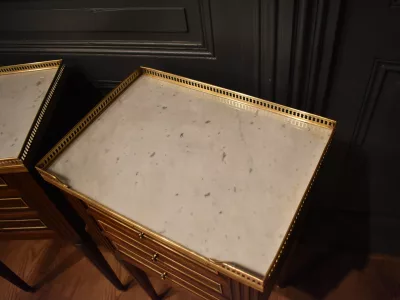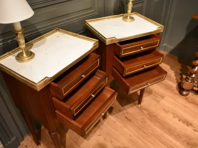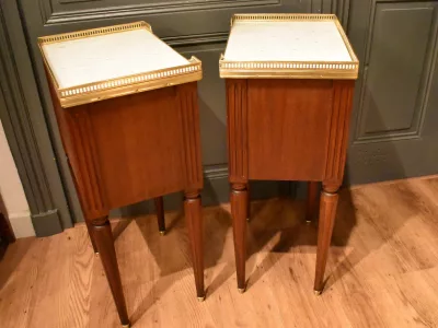 Paire de chevets de style Louis XVI en acajou ouvrant en façade par trois tiroirs avec petits boutons, les façades des tiroirs sont  décorés de baguettes de laiton. Les dessus en marbre blanc sont entourés d'une galerie ajourée. Les montants avant et arrière sont cannelés. Les quatre pieds cannelés se terminent par un sabot. Ces chevets en très bon état ont été nettoyés, les galeries démontées pour être polies. Chaque demande de renseignements par mail fera l'objet d'une réponse, merci de contrôler les messages indésirables