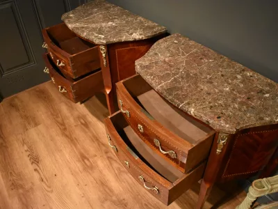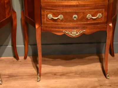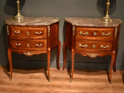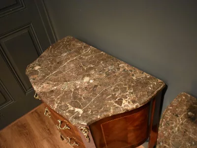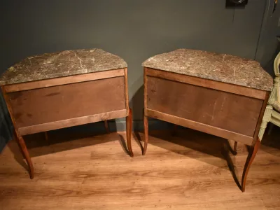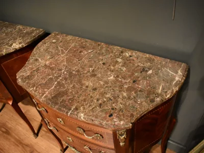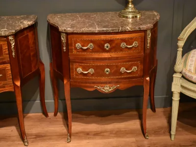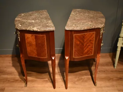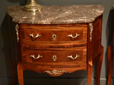 Deux petites commodes en marqueterie de style Louis XV, elles sont galbées en façade et sur les côtés, les dessus sont en marbre de couleurs. Elles ouvrent en façade par deux tiroirs, elles sont décorées de bronze sur les traverses, les montants et les pieds avant. Ces commodes très similaires ont des bronzes différents, la forme étant identique ainsi que les marbres. Leurs dimensions permettent une utilisation en chevets. Meubles nettoyés et revernis. A noter : absence de clés. Chaque demande de renseignements par mail fera l'objet d'une réponse, merci de contrôler les messages indésirables