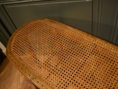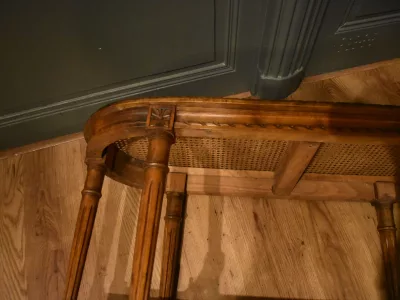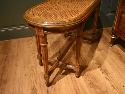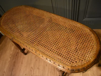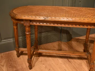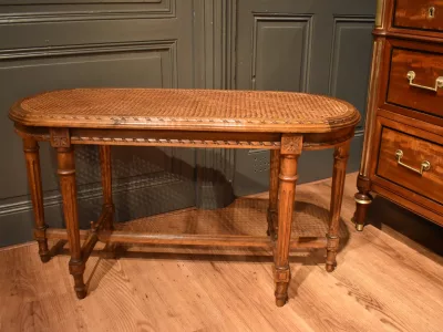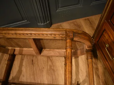 Banquette cannée de style Louis XVI en hêtre ciré, elle repose sur un piètement à six pieds réunis  par une entretoise. Le cannage est en très bon état. Chaque demande de renseignements par mail fera l'objet d'une réponse, merci de contrôler les messages indésirables.