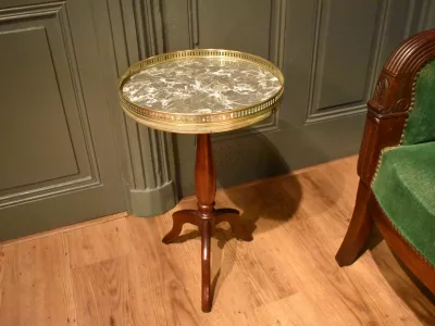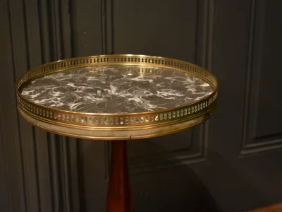 Petit guéridon en acajou de style Louis XVI, le dessus en marbre gris veiné est entouré d'une galerie ajouré, piètement  tripode. Envoi possible. Chaque demande de renseignements par mail fera l'objet d'une réponse, merci de contrôler les messages indésirables.