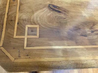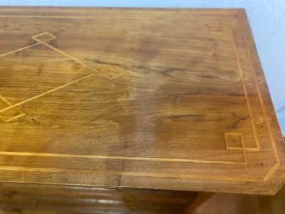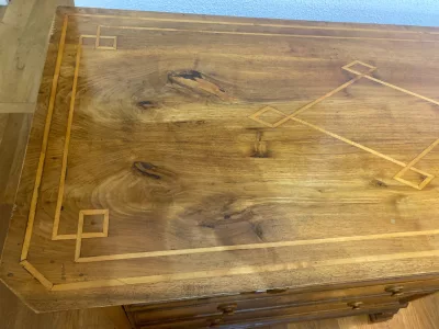 Commode louis Philippe en merisier avec incrustations de filets de bois clair sur le plateau. 4 tiroirs. Joli opposition de teinte de bois dans la doucine et les pieds. Très bon état.