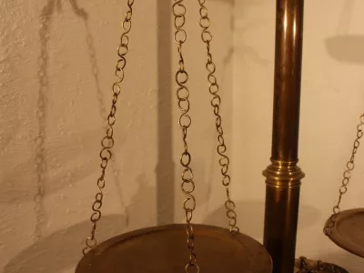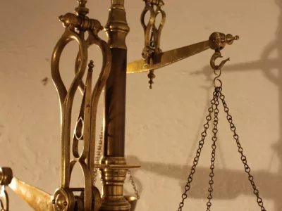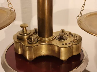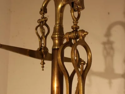 Exceptionnelle double balance de boucher du 19e siècle, entièrement en bronze et laiton, deux potences de part en part servaient pour la pesée de différentes quantités, Chapeautée d'une tête de vache, porte balance représentant des dauphins, poids dans son socle, très bel état.