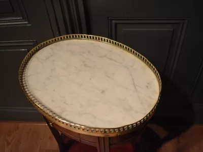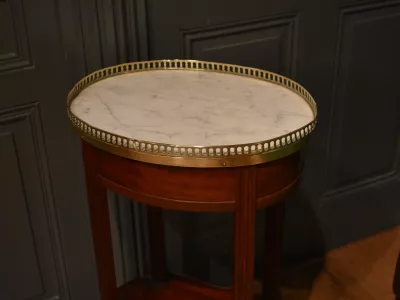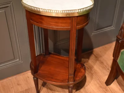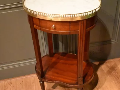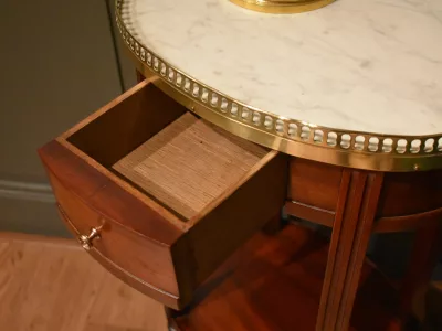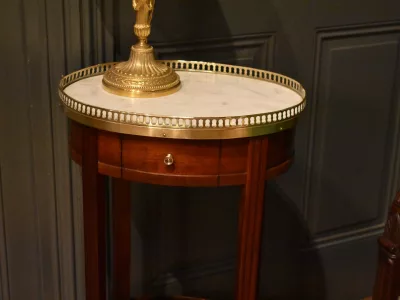 Table d'appoint en acajou et placage d'acajou de forme ovale, le dessus en marbre blanc est entouré d'une galerie ajourée en laiton. Elle ouvre en ceinture par un petit tiroir avec bouton. Les quatre pieds cannelés sont réunis par une tablette d'entrejambe. Elle repose sur quatre pieds gainés. A noter : manques sur le tour de la tablette d'entrejambe, visible sur les photographies. Espace entre la tablette et la ceinture : 39 cm. Chaque demande de renseignements par mail fera l'objet d'une réponse, merci de contrôler les messages indésirables.