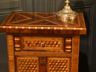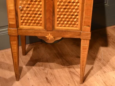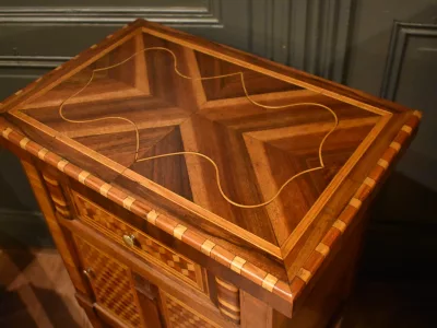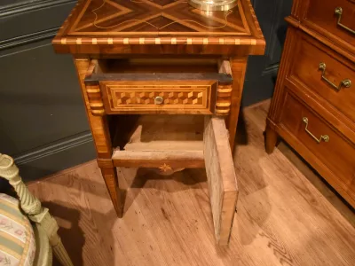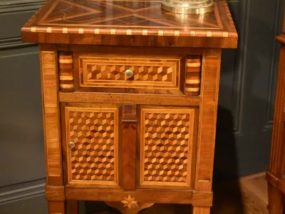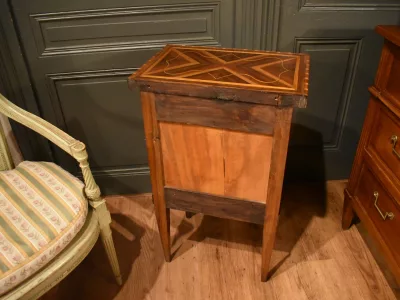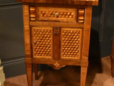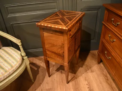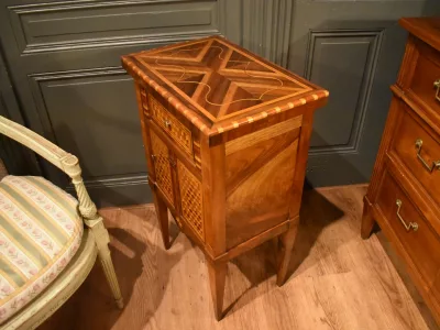 Chevet de style Louis XVI en noyer et marqueterie de bois de couleur, il ouvre en façade par un tiroir et une porte avec boutons en laiton. Le dessus est également ouvragé, ce chevet original est en très bon état. Chaque demande de renseignements par mail fera l'objet d'une réponse, merci de contrôler les messages indésirables.