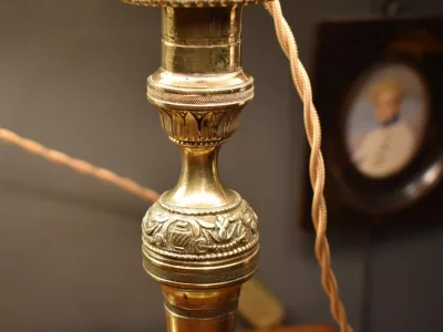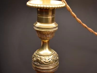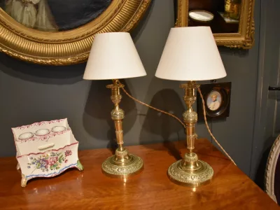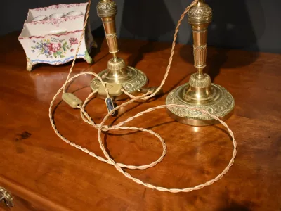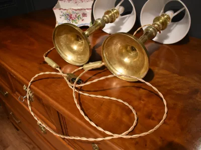 Paire de lampes montée à partir d'une paire de bougeoirs de style Louis XVI début 19 ième en bronze, finement ciselés. L'électrification est refaite avec une douille en métal doré E14, fils coton torsadés, les abat jour en coton sont neufs. Hauteur des lampes : 43 cm. Hauteur des bougeoirs : 28 cm. Diamètre de la base : 14 cm. Diamètres des  abat jour : 19 cm au maximum, 10 cm au minimum, hauteur de 13 cm. Envoi possible. Chaque demande de renseignements par mail fera l'objet d'une réponse, merci de contrôler les messages indésirables.