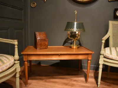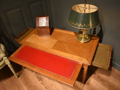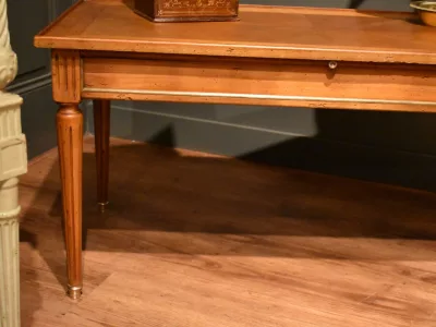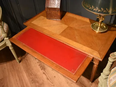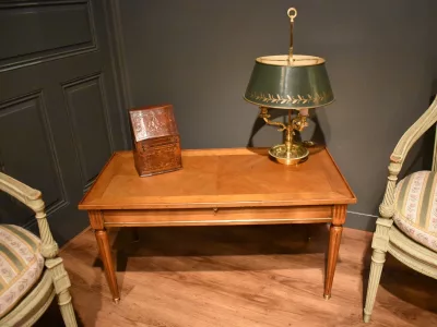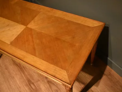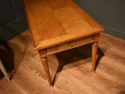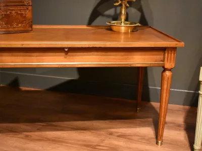 Table basse de style Louis XVI rectangulaire en bois clair massif et placage, elle ouvre avec un grande tirette gainée  d'un cuir rouge, et deux tiroirs latéraux. La ceinture est décorée de baguette de laiton, le plateau est entouré d'une baguette en bois. Les quatre pieds cannelés se terminent par un sabot. Quelques traces sur le plateau, visibles sur les photographies. Chaque demande de renseignements par mail fera l'objet d'une réponse, merci de contrôler les messages indésirables