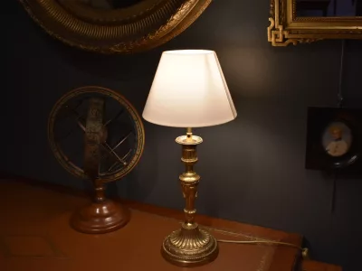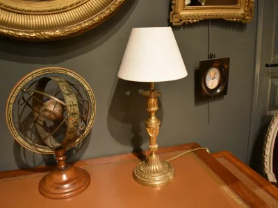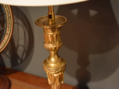 Lampe de style Louis XVI montée avec un bougeoir  en bronze doré à motifs de cannelures, godrons et chutes de lauriers. L'électrification est refaite avec une douille en métal doré E14. L'abat jour en coton est neuf. Hauteur de la lampe  : 45 cm. Hauteur des bougeoirs : 27  cm Diamètre de la base : 13 cm Diamètres des abat jour : 19 cm au maximum, 10 cm au minimum, hauteur de 13 cm. Envoi possible. Chaque demande de renseignements par mail fera l'objet d'une réponse, merci de contrôler les messages indésirables