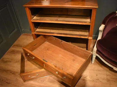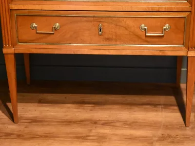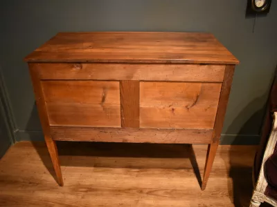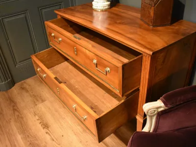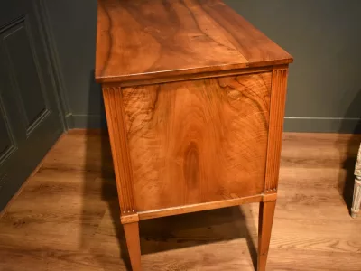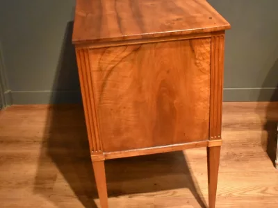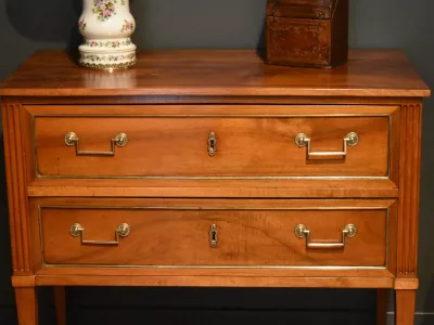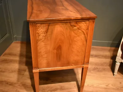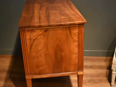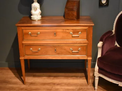 Commode sauteuse  Louis XVI en noyer ouvrant en façade par deux tiroirs avec poignées tombantes. Les façades des tiroirs sont décorées de baguette de laiton, elle repose sur quatre pieds gainés à section carrée. Les montants avant et arrière sont cannelés. Commode datant de la fin du 18 ième en très bon état nettoyée et repatinée  réalisée avec un noyer de belle qualité. A noter : absence de clé, restauration ancienne sur un pied arrière. Chaque demande de renseignements par mail fera l'objet d'une réponse, merci de contrôler les messages indésirables.