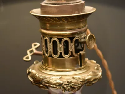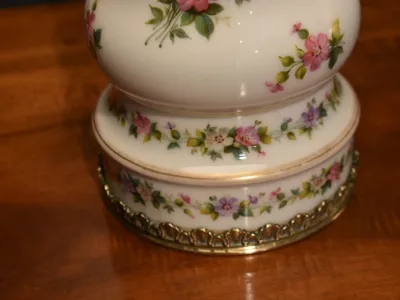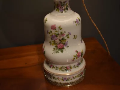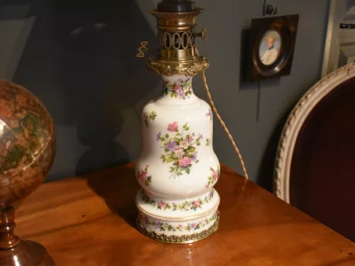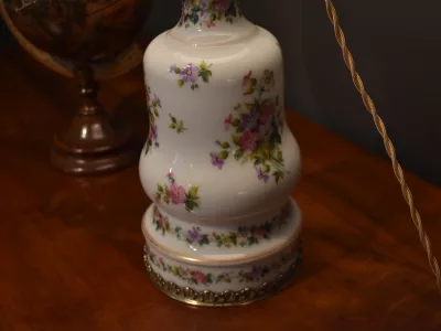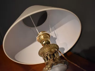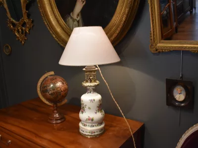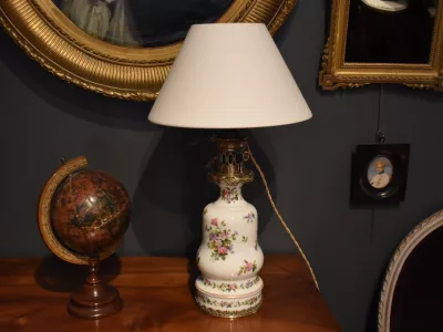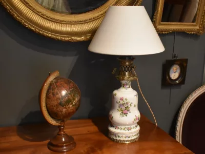 Lampe en porcelaine avec monture en bronze, à décor de petites  fleurs sur fond blanc. L'électrification est refaite entièrement avec une douille en métal doré E27,  avec du fil coton or. L'abat jour en coton est neuf. Hauteur des lampes : 54.5 cm. Hauteur des lampes sans abat jour : 34 cm. Diamètre des bases : 13  cm. Diamètres des abat jour : 30 cm au maximum, 13 cm au minimum, hauteur de 18.5 cm. Envoi possible. Chaque demande de renseignements par mail fera l'objet d'une réponse, merci de contrôler les messages indésirables.