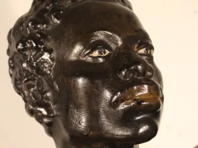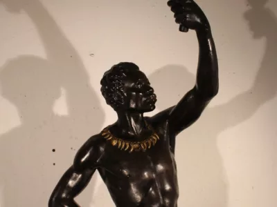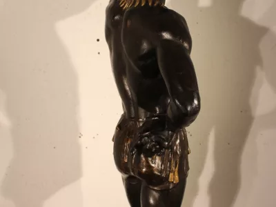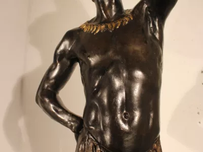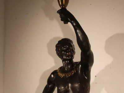 Statue fin 19e siècle représentant un africain torchère en plâtre polychrome, habillé d'une pagne et d'un collier doré, très beau travail avec une grande finesse au niveau de sa musculature et de son visage, très belle statue de décoration.