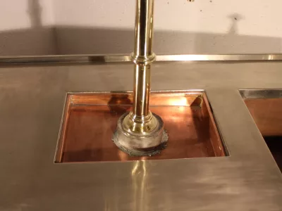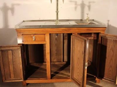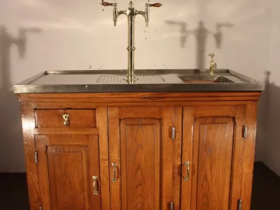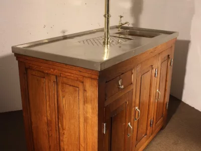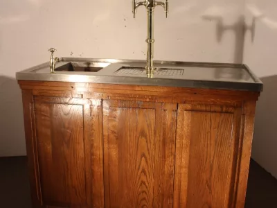 Petit bar de brasserie vers 1900, en chêne blond ouvrant du côté travail par trois portes et un tiroir, côtés panneautés, tireuse à double becs en laiton, évier en cuivre, connexion évacuation, branchement eau et bière possible, plateau nickelé, bar très intéressant par ses petites dimensions, excellent état.