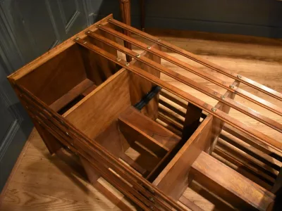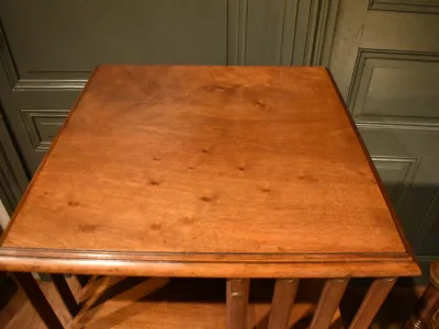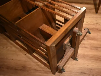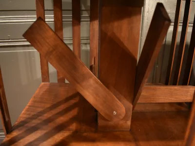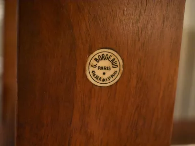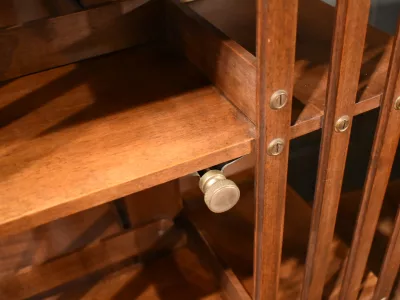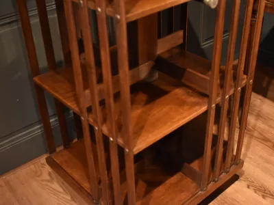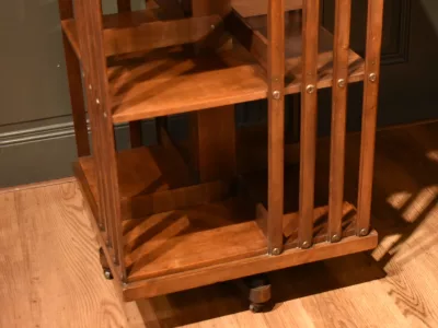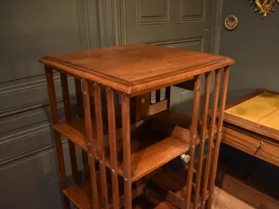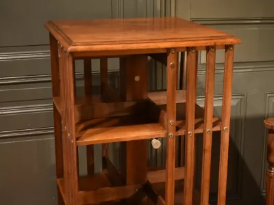 Bibliothèque tournante en noyer à trois niveaux de rangement, sur piètement à roulettes. Cette bibliothèque pour la marque G.Borgeraud Paris Rue des st Père. Les cloisons sont amovibles sur les deux niveaux inférieurs. Dimensions des casiers : 28 cm de longueur, 20 cm de profondeur, hauteur de 33 cm pour le niveau inférieur et du milieu, hauteur de 26 cm pour le niveau supérieur. Le système de blocage fonctionne. Chaque demande de renseignements par mail fera l'objet d'une réponse, merci de contrôler les messages indésirables.