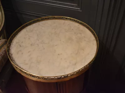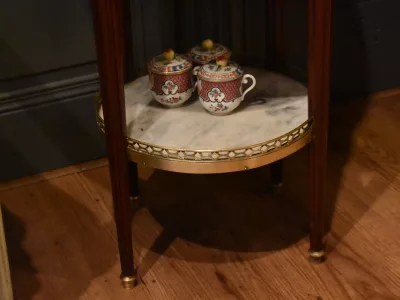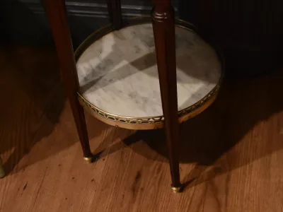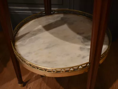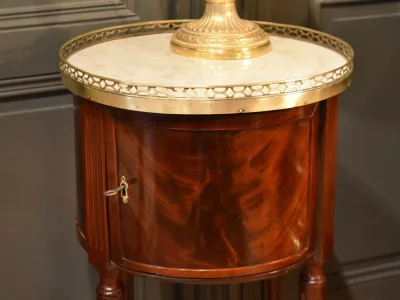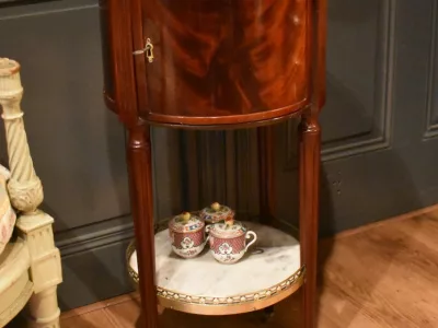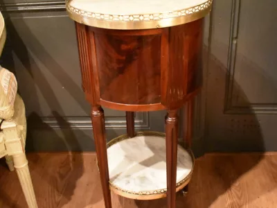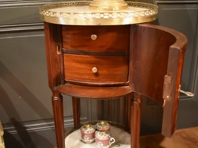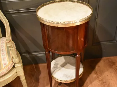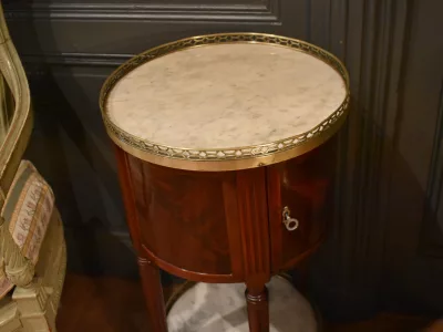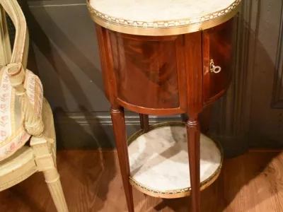 Chevet en acajou et placage d'acajou Louis XVI, de la fin du 18 ème, de forme ronde visible sur toutes les faces. Il ouvre par une porte découvrant deux tiroirs avec boutons en laiton. Le dessus de marbre blanc est entouré d'une galerie ajourée. Les quatre pieds cannelés sont réunis par une tablette en marbre blanc également entourée d'une galerie ajourée. Ils se terminent par un sabot. Petit chevet ou table d'appoint peu courant, entièrement reverni. Espace entre la tablette et la partie haute : 30 cm. A noter serrure et clé postérieurs. Chaque demande de renseignements par mail fera l'objet d'une réponse, merci de contrôler les messages indésirables.