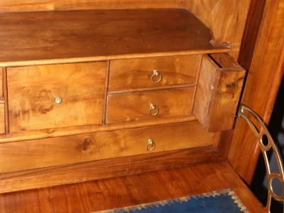 Petit secrétaire Louis Philippe en noyer , dessus en noyer massif ainsi que les tiroirs , il ouvre par quatre tiroirs dont un à doucine et un abattant , le théâtre est composé de six tiroirs et de deux tiroirs secrets , profondeur abattant ouvert 83 cm , finition cirée , vers 1850 ensemble en très bon état