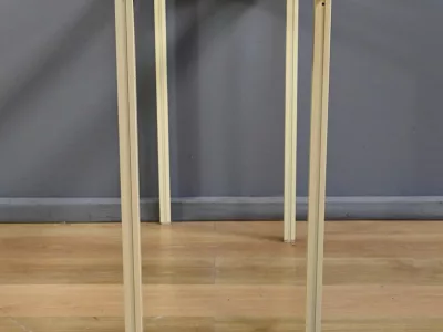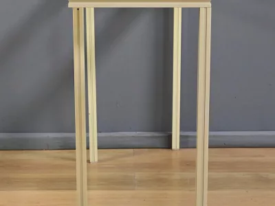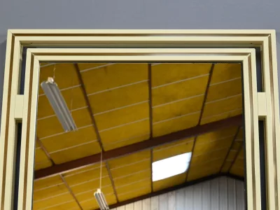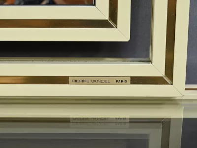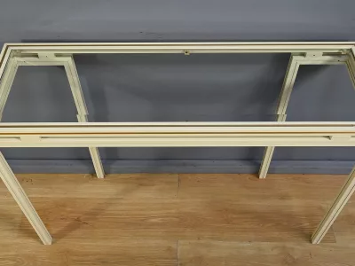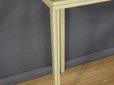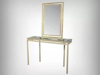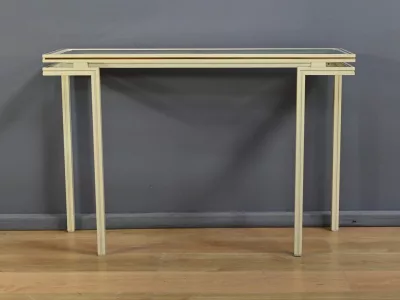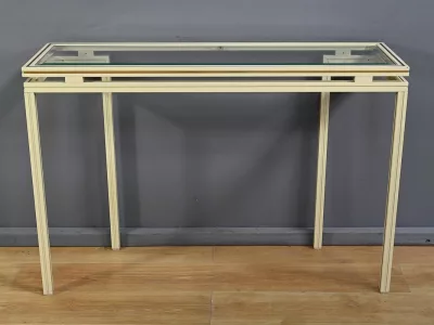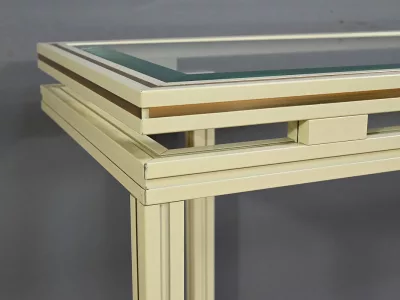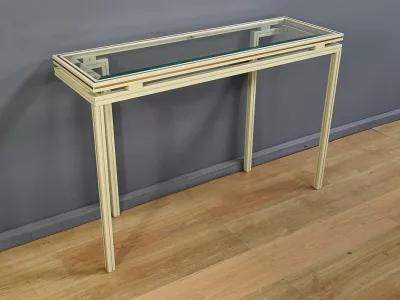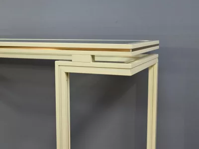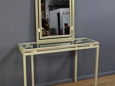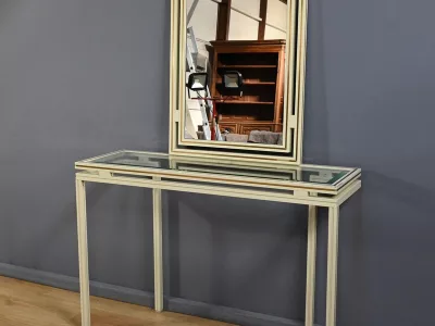 Specchio e consolle anni Settanta in metallo verniciato con fasce in bronzo dorato, firmati "PIERRE VANDEL PARIS". La consolle ha un piano in vetro bisellato. Ottime condizioni, con qualche traccia di usura sul piano. Contattateci per la consegna. Riferimento: 398 V