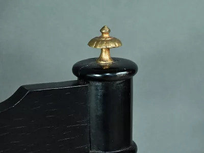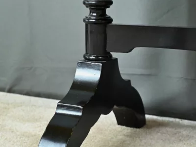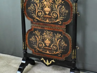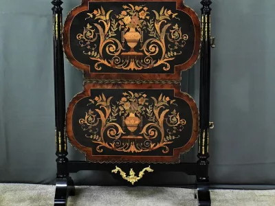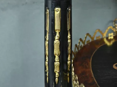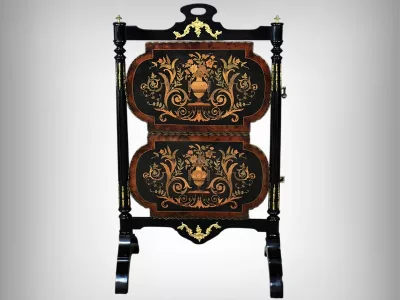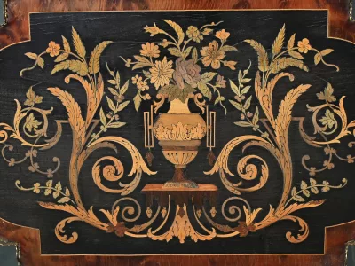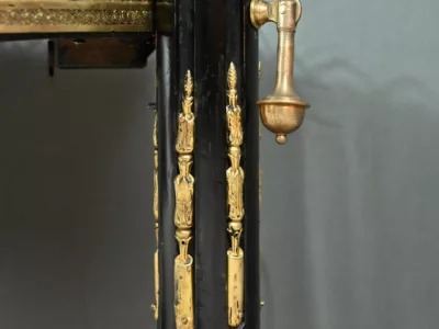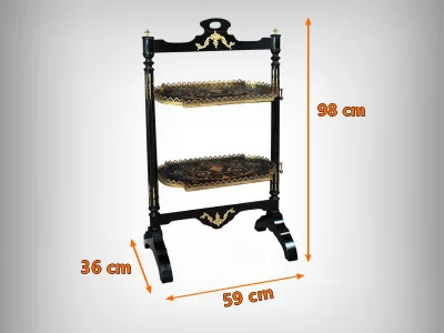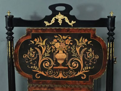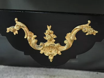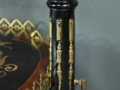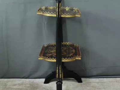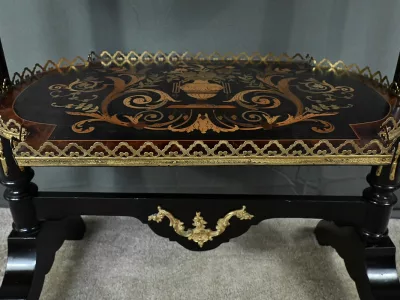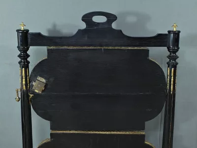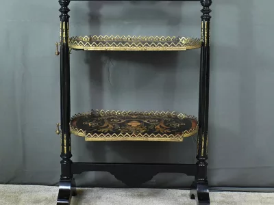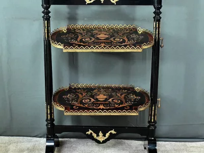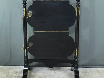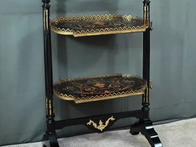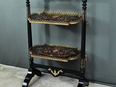 Mobiletto in legno nero, epoca Napoleone III, con intarsi in mogano e legno satinato e decorazioni in bronzo finemente intagliato. I due ripiani sono pieghevoli. Restaurato nel nostro laboratorio e in ottime condizioni. Contattateci per la consegna. Riferimento: 526 P