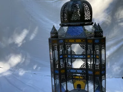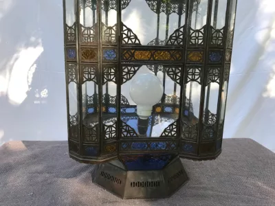 Lampada grande in metallo e vetro blu e giallo. Cablato con due lampadine. Buone condizioni generali.