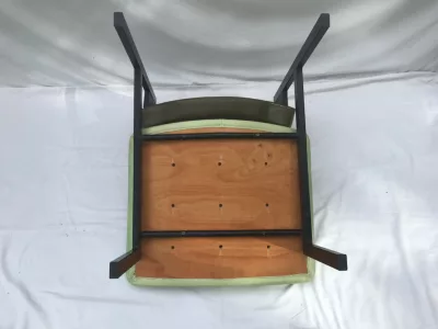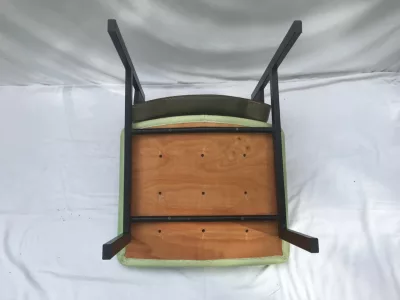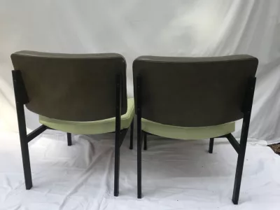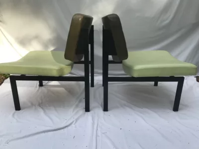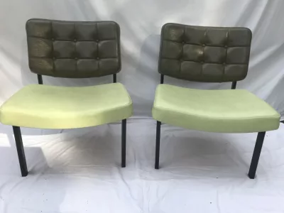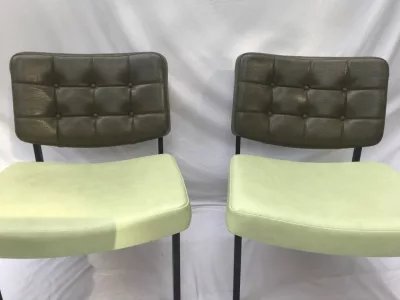 Sedie degli anni Cinquanta e Sessanta in metallo e similpelle, nello stile di Pierre GUARICHE. Alcuni segni di usura ma in ottime condizioni generali. Sette sedie disponibili. Prezzo ciascuno: 290 euro.