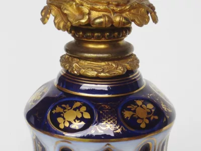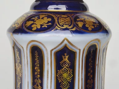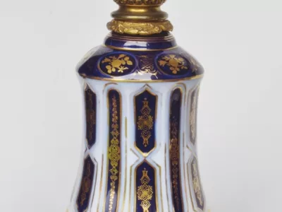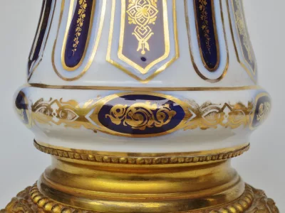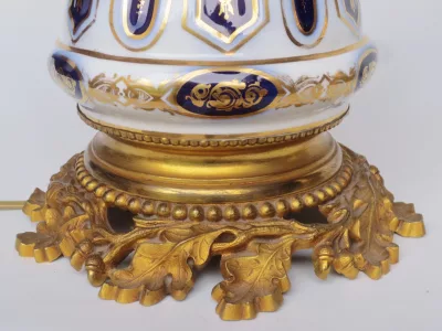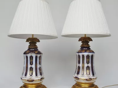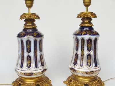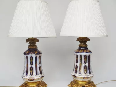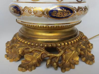 Lampade di metà Ottocento in porcellana di Bayeux con decorazione dipinta in oro e bronzo dorato, in perfette condizioni. Presentate con un paralume base non incluso nella vendita. Altezza senza paralumi: 34 cm.