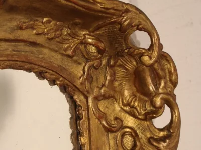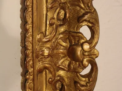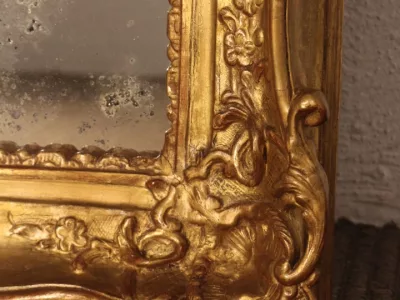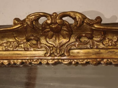 Specchio del XIX secolo con retro al mercurio, cornice in legno dorato e stucco. Retro in pino.