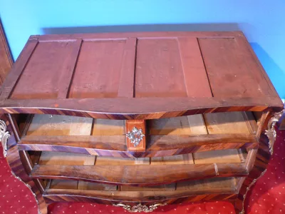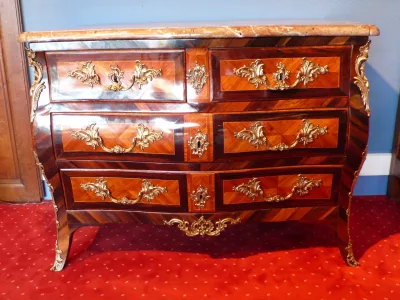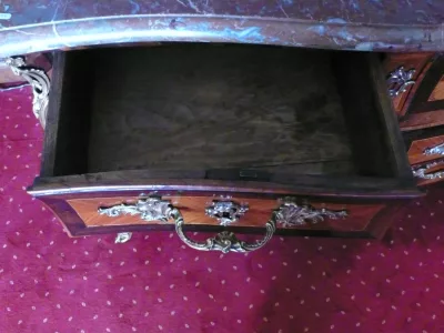小ルイ15世時代のローズウッドの上品で軽い木製のインレイの「tombeau」チェスト。期間bronzeware。大理石の上