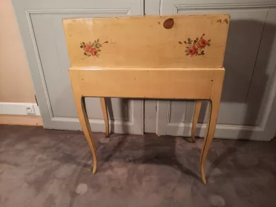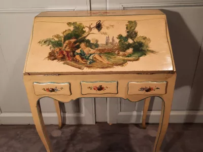 エレガントなルイ 15 世様式のスロープトップ デスク。塗装装飾が施されています。 19世紀後半から20世紀初頭。とても良い状態。