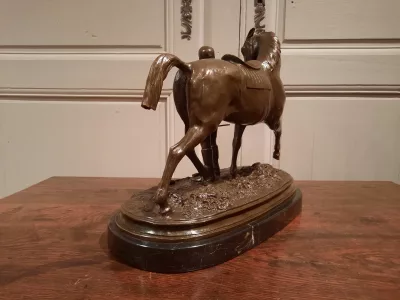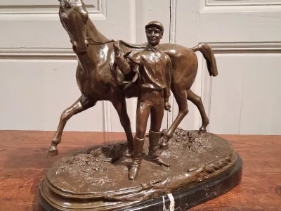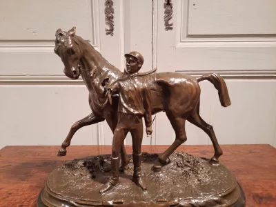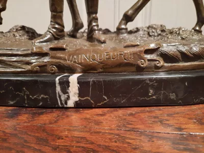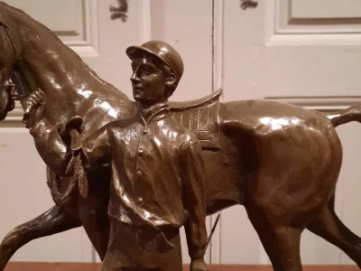 「VAINQUEUR」というタイトルの馬を持つ魅力的なブロンズ騎手、PJ MENE と署名。 20世紀半ば。