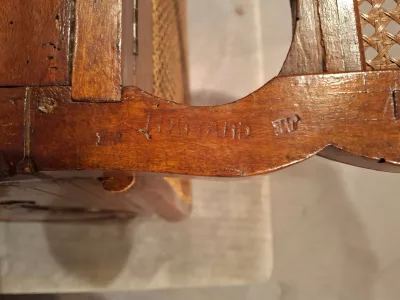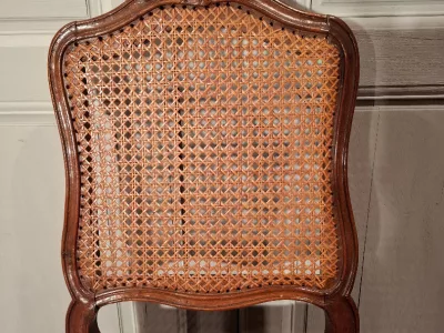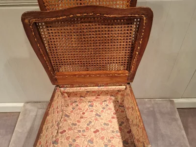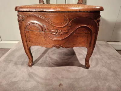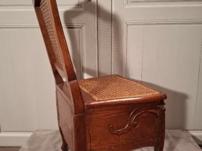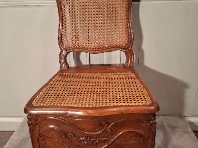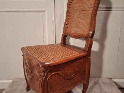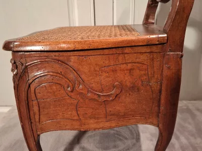 ルイ 15 世時代の、籐の座面を備えた、豊かに彫刻されたブナ材のコモード チェア。