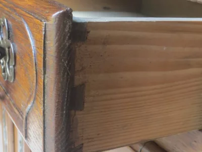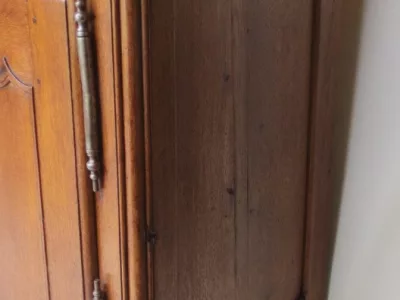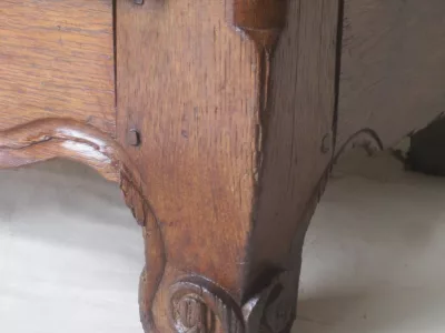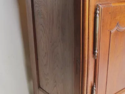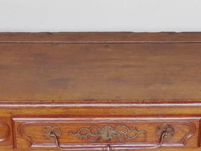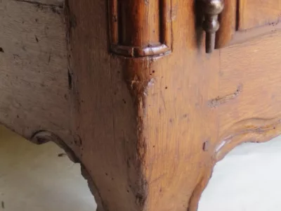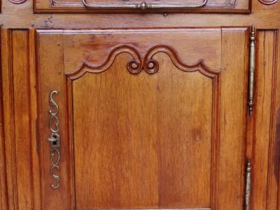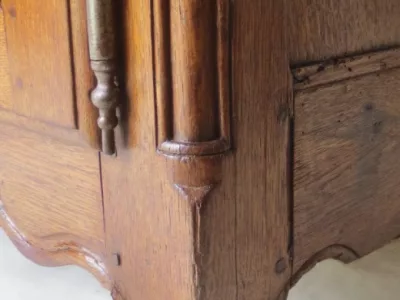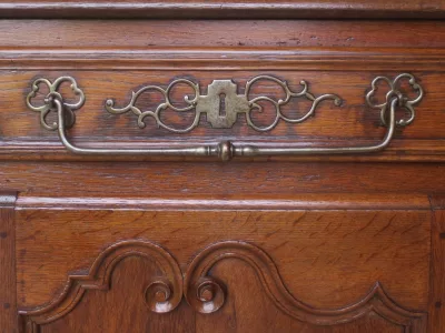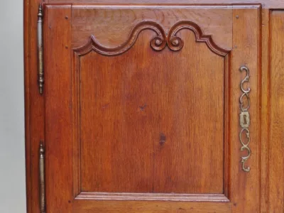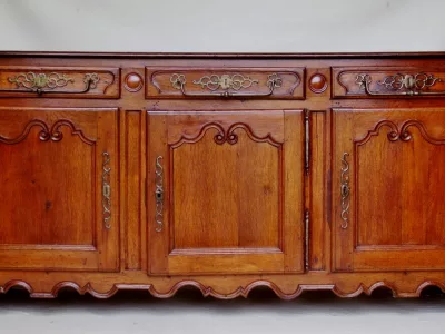 18世紀ロレーヌ産のオーク材製サイドボード。扉3枚、引き出し3つで構成されています。美しい留め具と取っ手が印象的です。全体的に良好な状態です。引き出しの内側は交換済みで、天板に小さなシミがあり、脚は若干摩耗しています。