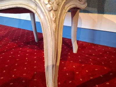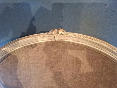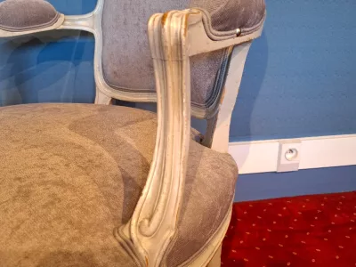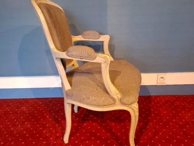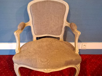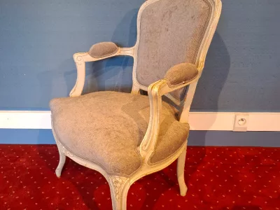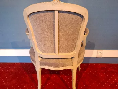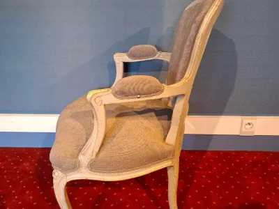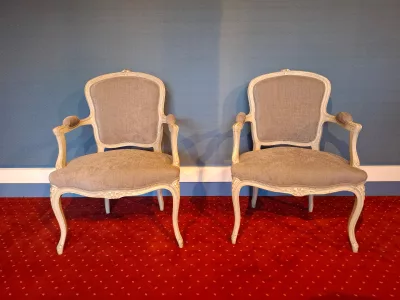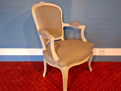 ルイ15世様式の「カブリオレ」アームチェア2脚。塗装済みのブナ材を使用。完全に修復され、張替え済み。非常に良好な状態。19世紀後半から20世紀初頭。全高:85cm、座面高:42cm。