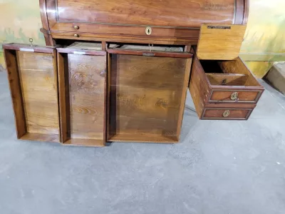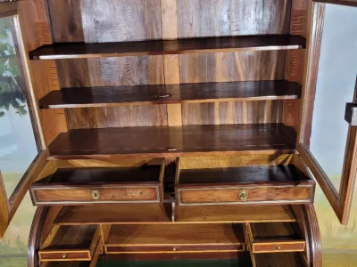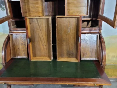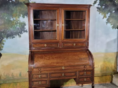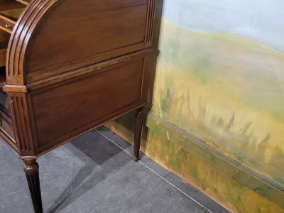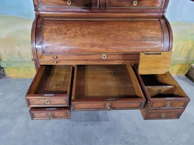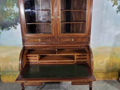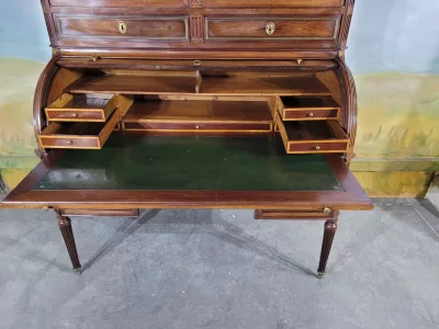 ルイ16世時代のマホガニー製書棚。シリンダー式の開口部とスライド式の書き物台を備えた内部。高品質。