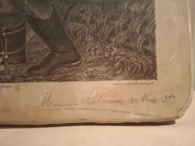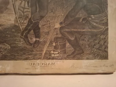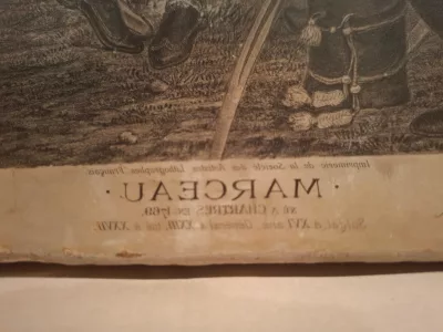 セルジャン マルソー (1751-1847) によって彫刻された 19 世紀の石版石。碑文: Imprimerie de la Société des Artistes Lithographes Français。厚さは4センチ。体重:21キロ。
