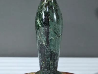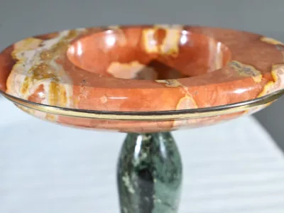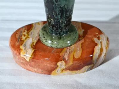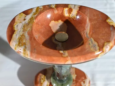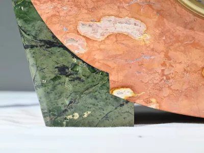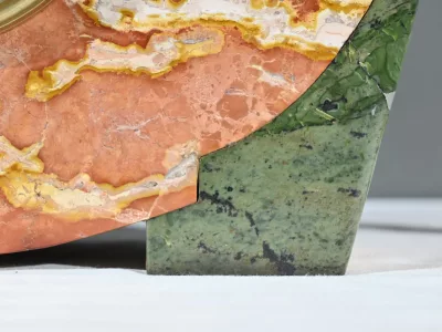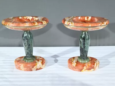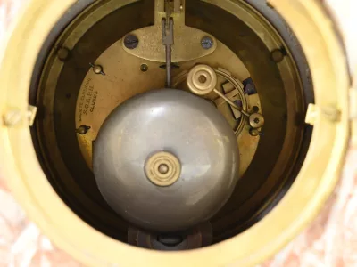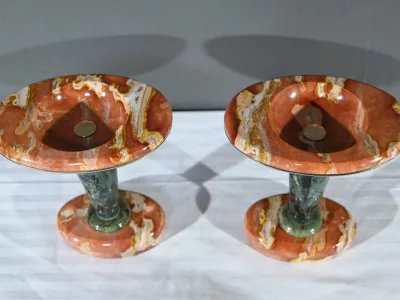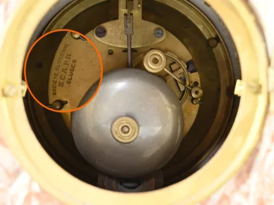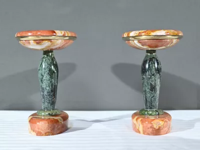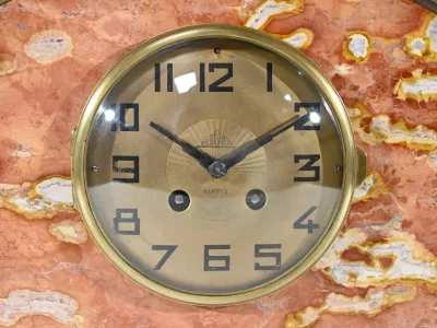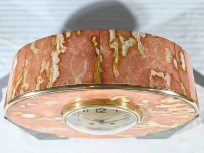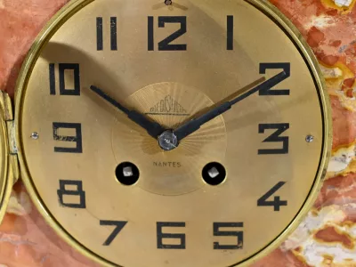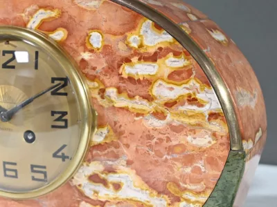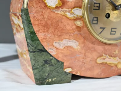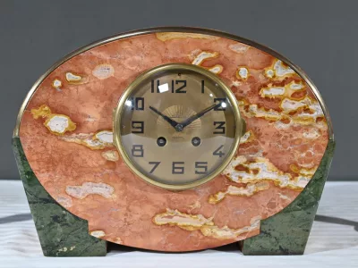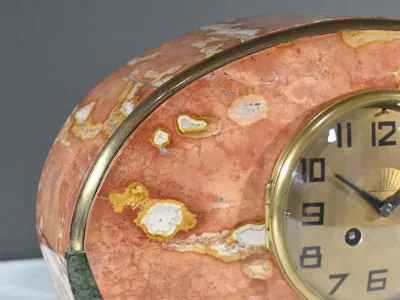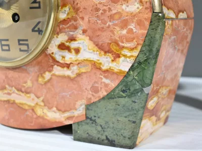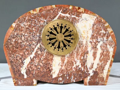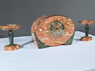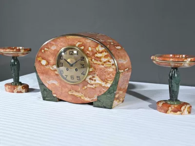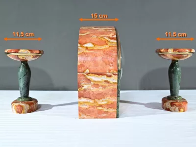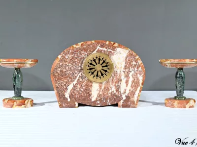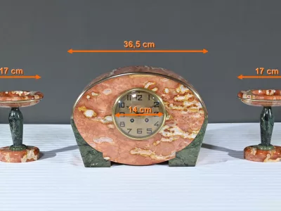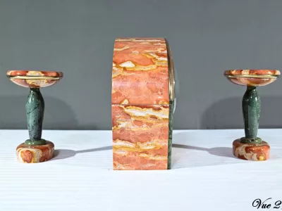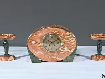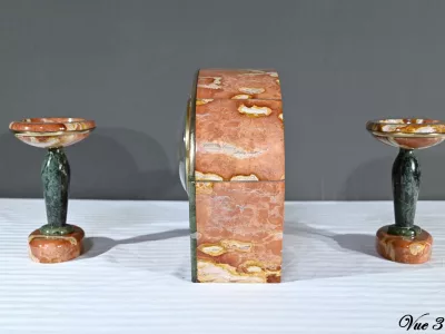 Mantelgarnituur bestaande uit een klok en twee cassolettes in drie verschillende knikkers. Gesigneerd DIEDISHEIM. Circa 1920. Uitstekende staat. Het uurwerk is compleet inclusief sleutel maar dient gereviseerd te worden. Vraag ons om een offerte voor de revisie met garantie. Neem contact met ons op voor bezorging. Referentie: 21 C