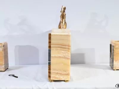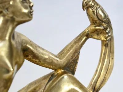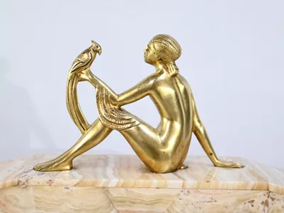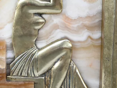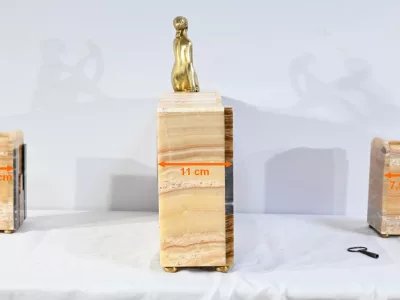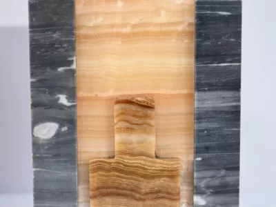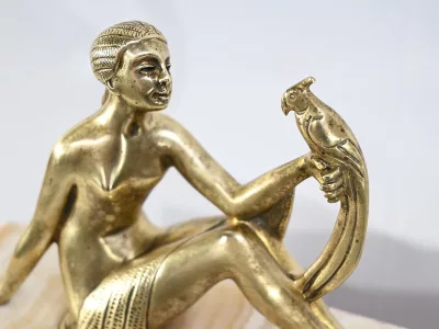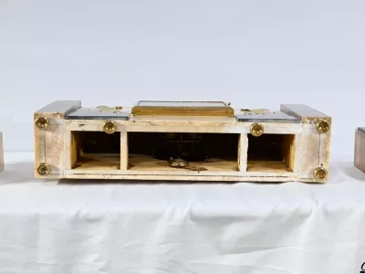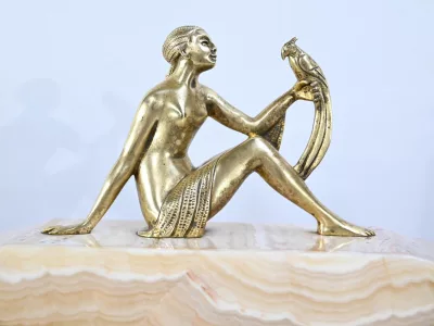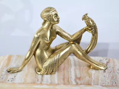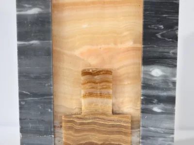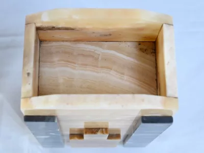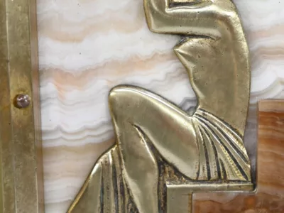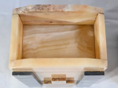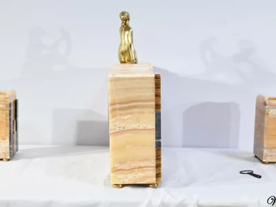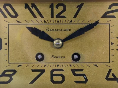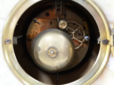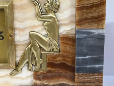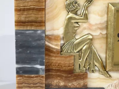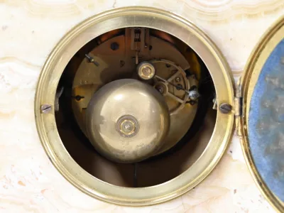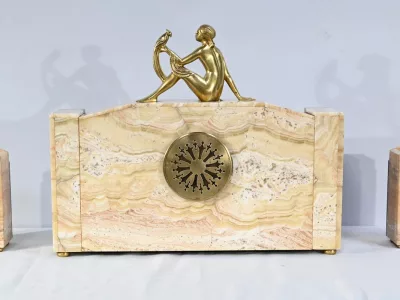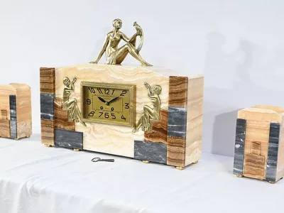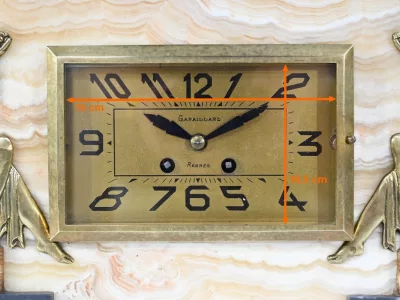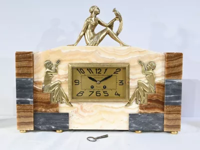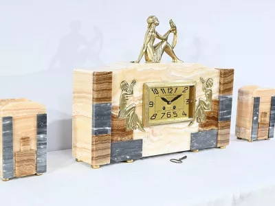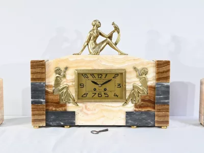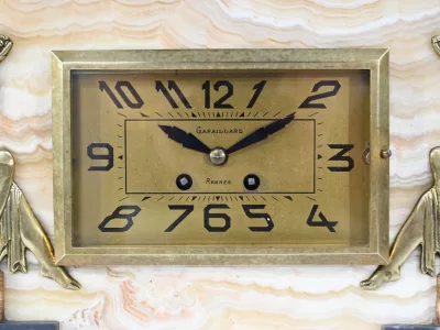 Mantelgarnituur van tweekleurig onyx en marmer, bestaande uit een klok en twee cassettes. Klok gesigneerd door Alexandre Gapaillard, oprichter van de Grand Comptoir National d'Horlogerie in Rennes in 1850. Circa 1920. De klok is compleet en kan op verzoek worden herzien. Neem contact met ons op voor bezorging. Referentie; 300623