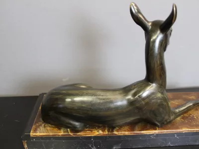 Art Deco sculptuur van een antilope in spelter op een voet van onyx en zwart marmer. Gesigneerd op de basis Rochard (Irenee Rochard, 1906-1984). Goede algemene staat.