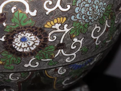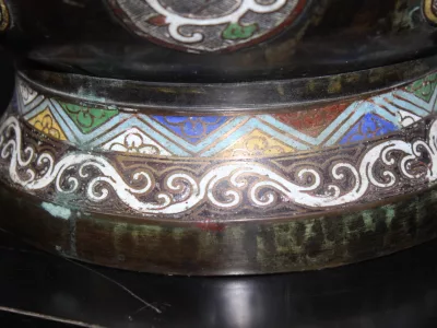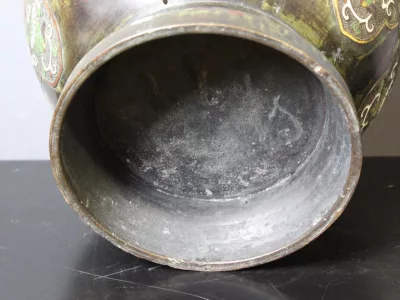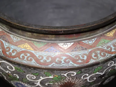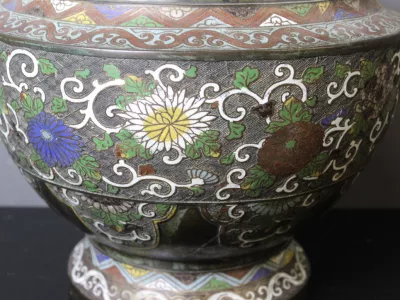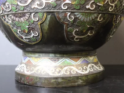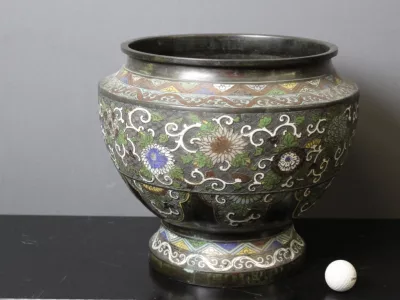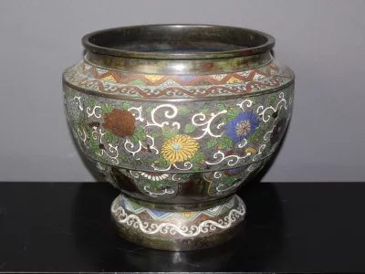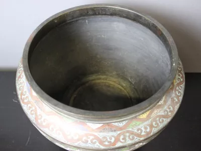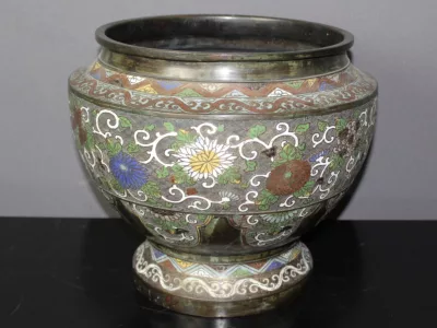Negentiende-eeuwse, Japanse cachepot in broanezz en cloisonne-email. Heel goede staat.