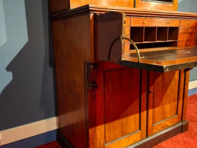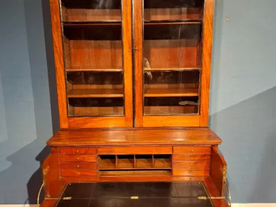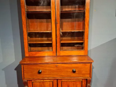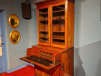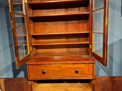 Negentiende-eeuwse Engelse bureau-boekenkast in mahoniehout met een ingebouwd interieur met leren schrijfoppervlak. Zeer goede staat, de mahoniehouten planken zijn van latere datum.